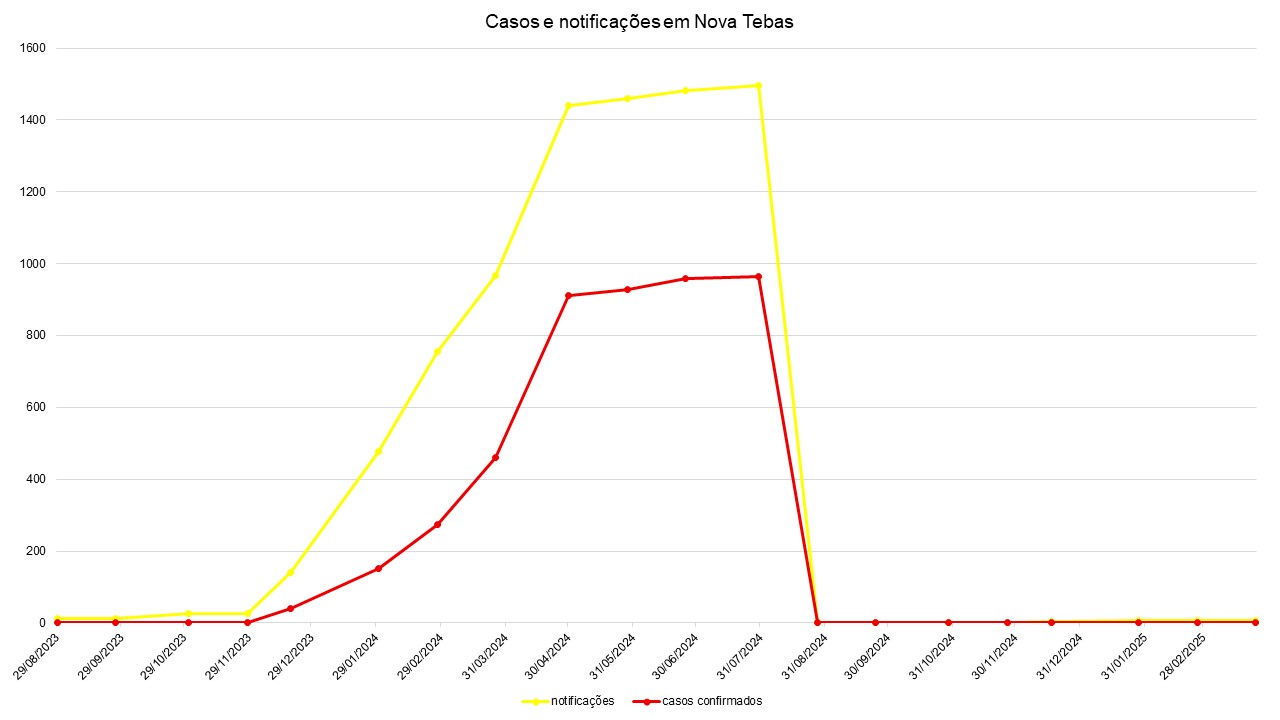 Durante o período epidemiológico (agosto a julho) de 2023/2024, o município de Nova Tebas-PR enfrentou uma grave epidemia de dengue, com um total de 1.496 notificações e 965 casos confirmados, caracterizando uma situação de emergência em saúde pública. Esse aumento expressivo dos casos refletiu não apenas as condições climáticas favoráveis à proliferação do mosquito Aedes aegypti, mas também a elevada presença de diversos criadouros em domicílios e terrenos baldios, agravada por práticas inadequadas de descarte de resíduos e armazenamento de água.